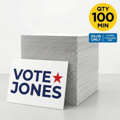 Economy Political Yard Signs โ 24″ ร 18″ printed on durable 4mm Coroplast. Available in 1-Color or 2-Color printing. Optional Union Bug. Optional H-Stakes. Starting at $2.29/unit.